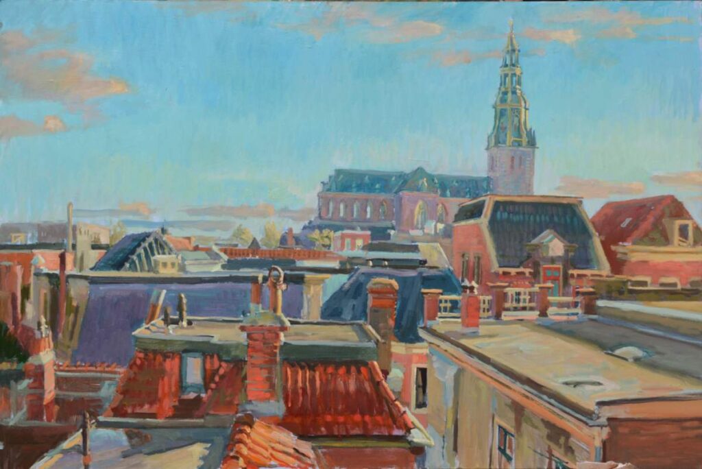 “Panorama met A-kerk, Groningen” 62×92 cm olieverf op paneel